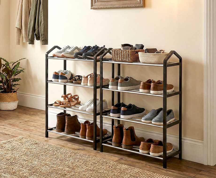 Met vier stevige planken biedt dit rek plek voor een flinke collectie schoenen, terwijl het nauwelijks ruimte inneemt. Ideaal voor in de hal, slaapkamer of garderobe.