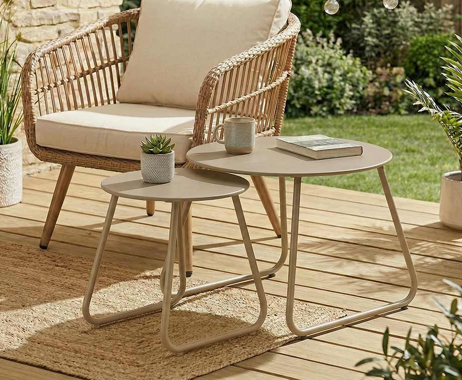 Twee tafels, eindeloze mogelijkheden. Deze ronde bijzettafels in beige staan prachtig naast de bank, op het balkon of onder de veranda. En dankzij het slimme formaat schuif je ze zo bij of onder elkaar.