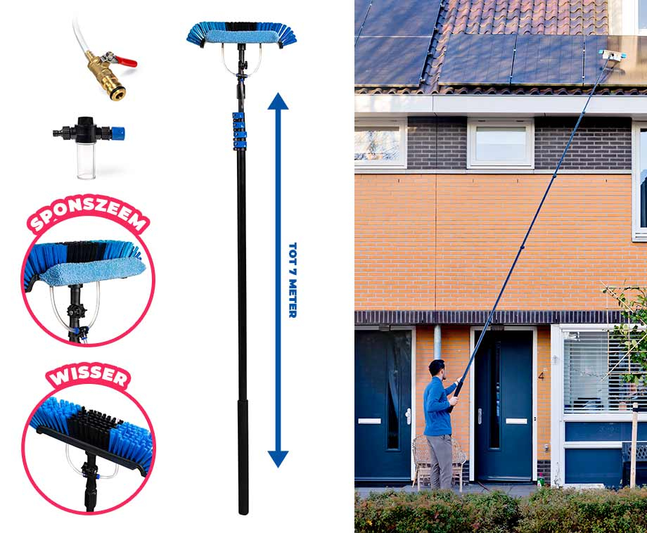 Lastige plekken zoals ramen op hoogte, zonnepanelen of dakpannen? Met deze telescopische waterbezem wordt schoonmaken ineens verrassend simpel. Dankzij de uitschuifbare steel bereik je moeiteloos plekken tot wel 9 meter hoogte, gewoon vanaf de grond.